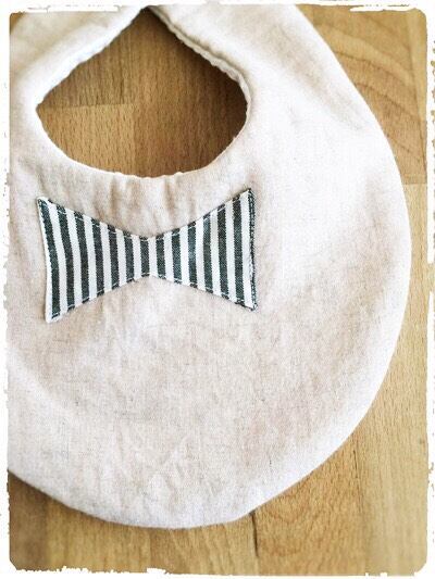 【再販です】かわいいスタイ *ストライプリボンアップリケ* 生成り