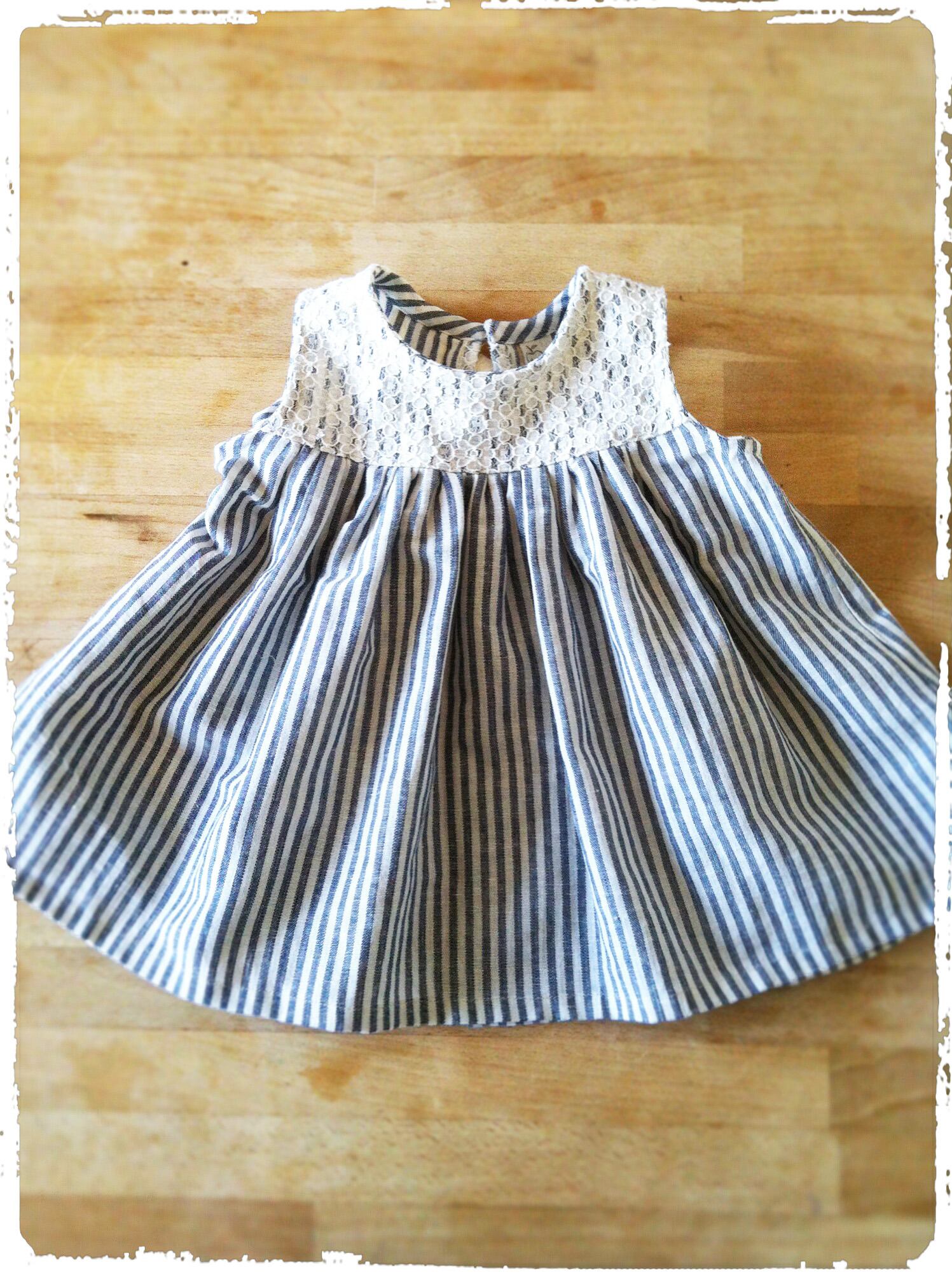 【80size】ギャザーたっぷりエプロンドレス *レース×ストライプ*